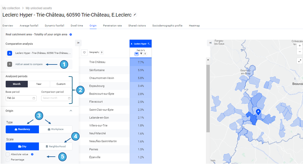 - The origin corresponds to the number of visits made to the address or area analysed from each city or neighbourhood over a month, as a percentage or absolute value (with the possibility of distinguishing between residents and workers in the area).