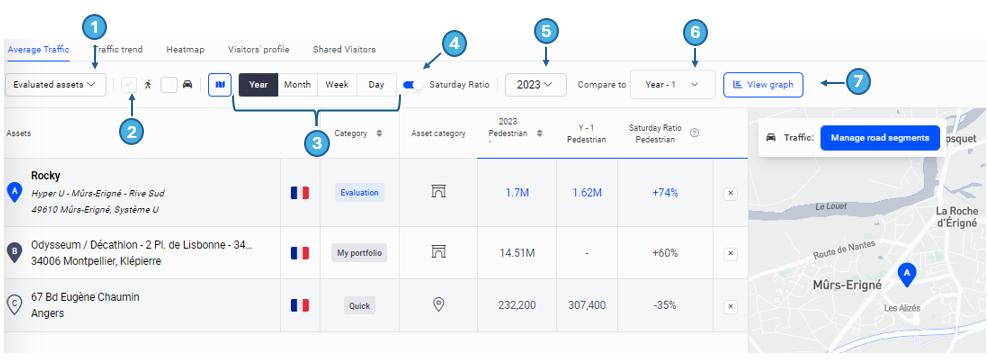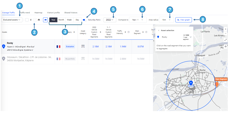 Example for vehicle traffic: In 2022, average traffic on the selected road segments represented 2.02 million vehicles. The traffic was equivalent to that of 2021. Over the same year, the average traffic of all road segments inside the chosen radius of the Hyper U was 1.94 million vehicles.
