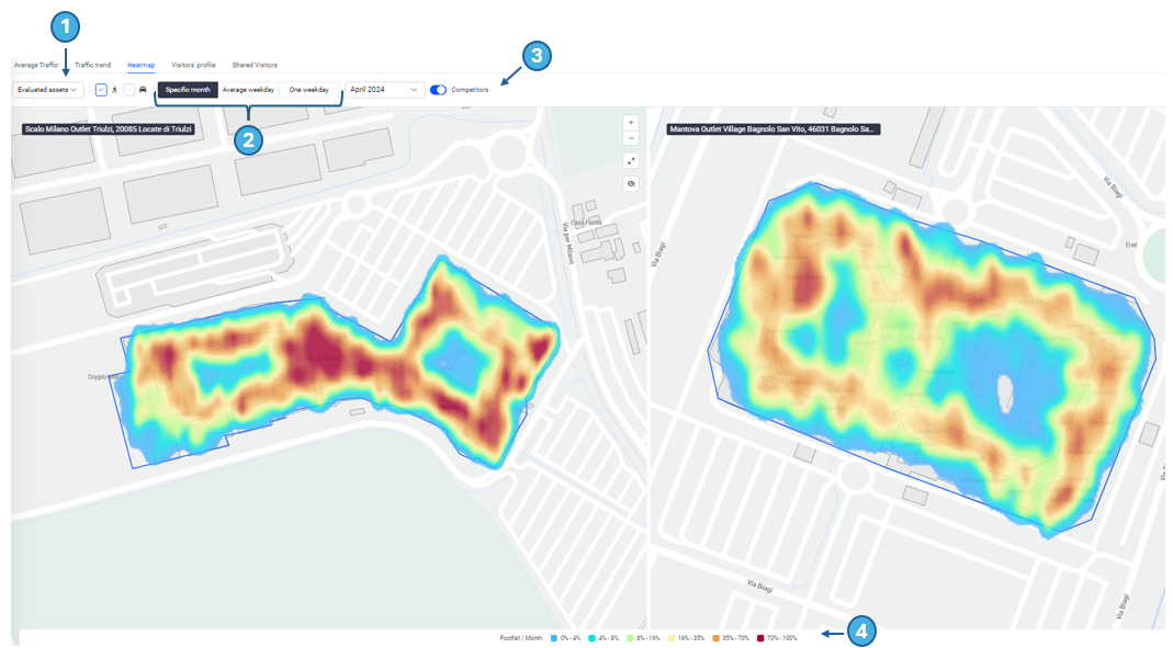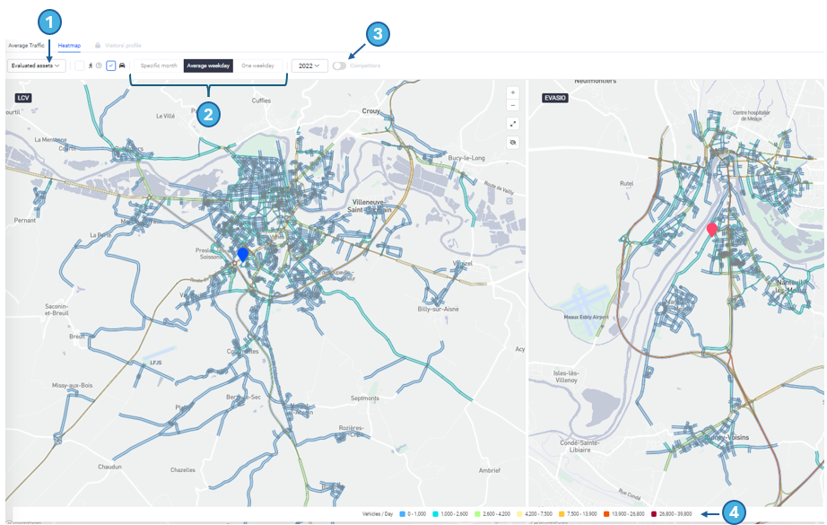 Underneath the graph is a legend (4) whose thresholds and related colours vary depending on the area's footfall. The redder the colour is, the higher the footfall is (on the contrary, the blue shows the lowest traffic). Vehicle traffic is displayed within a 20-minute driving isochrone from your point of interest.