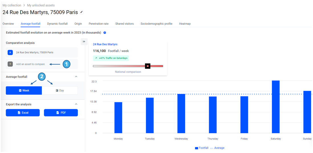 Example: In 2023, 116,100 visitors visited 24 rue des Martyrs in Paris on average per week. On Saturdays, footfall was 47% higher than on other days of the week.