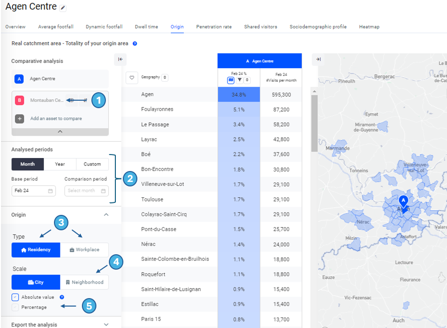 The origin corresponds to the number of visits made to the address or area analysed from each city or neighbourhood over a month, as a percentage or absolute value (with the possibility of distinguishing between residents and workers in the area).