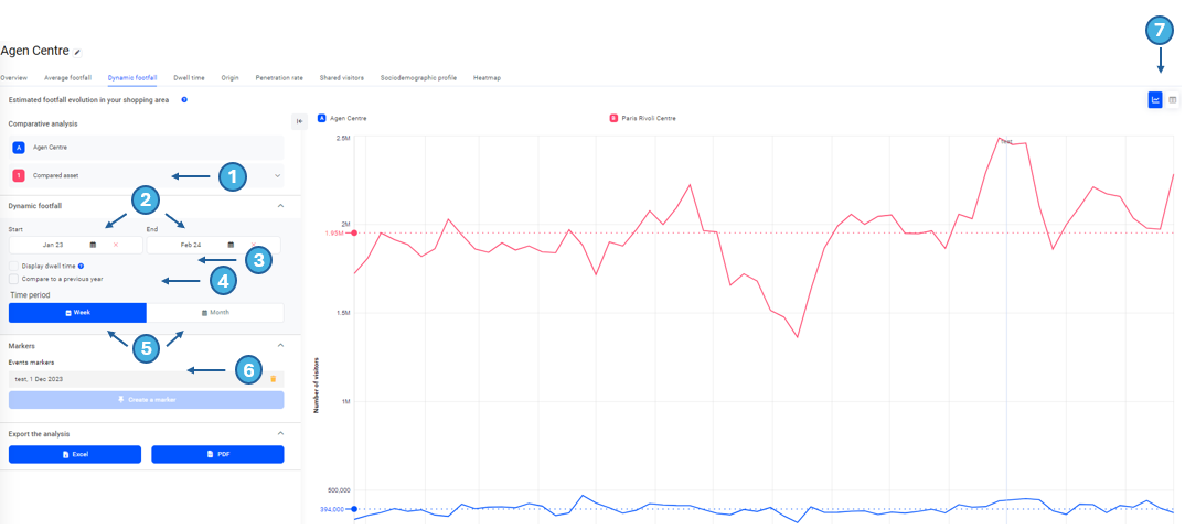 Important: Comparing different types of assets (address vs shopping centre) is not always relevant. Because of the lack of relevancy and the different methodologies behind the footfall computation., comparisons are available only between assets that can be compared:
