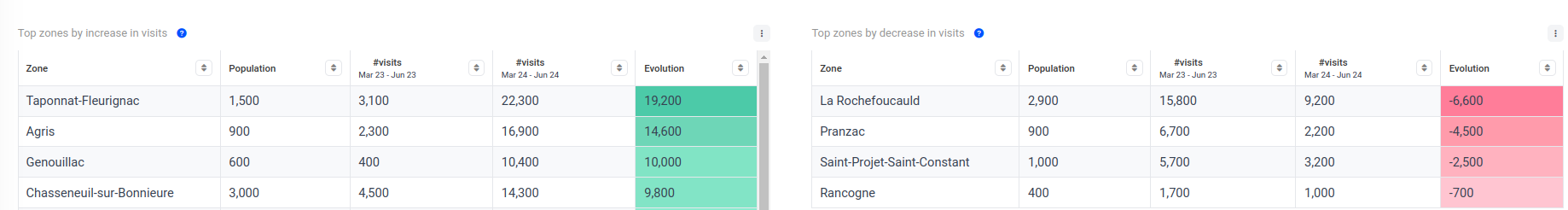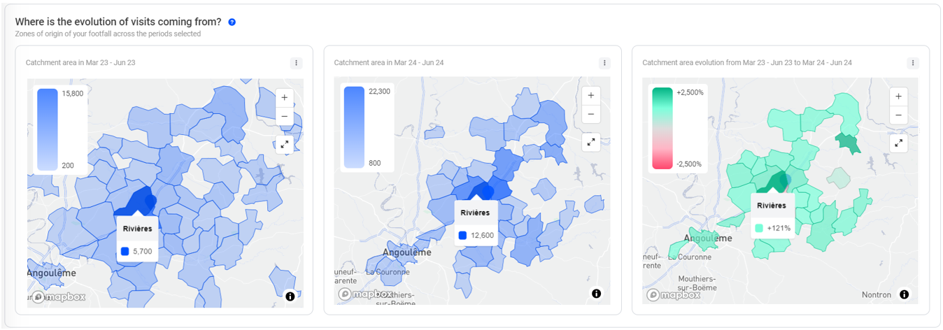 Example (maps and tables): Between March and June 2023, 5,700 visits were made by Rivières inhabitants. Over the same period in 2024 (March to June), 12,600 visits were made by its inhabitants. In total, this represents a gain of 6,900 visits between the 2 periods (+ 121%).