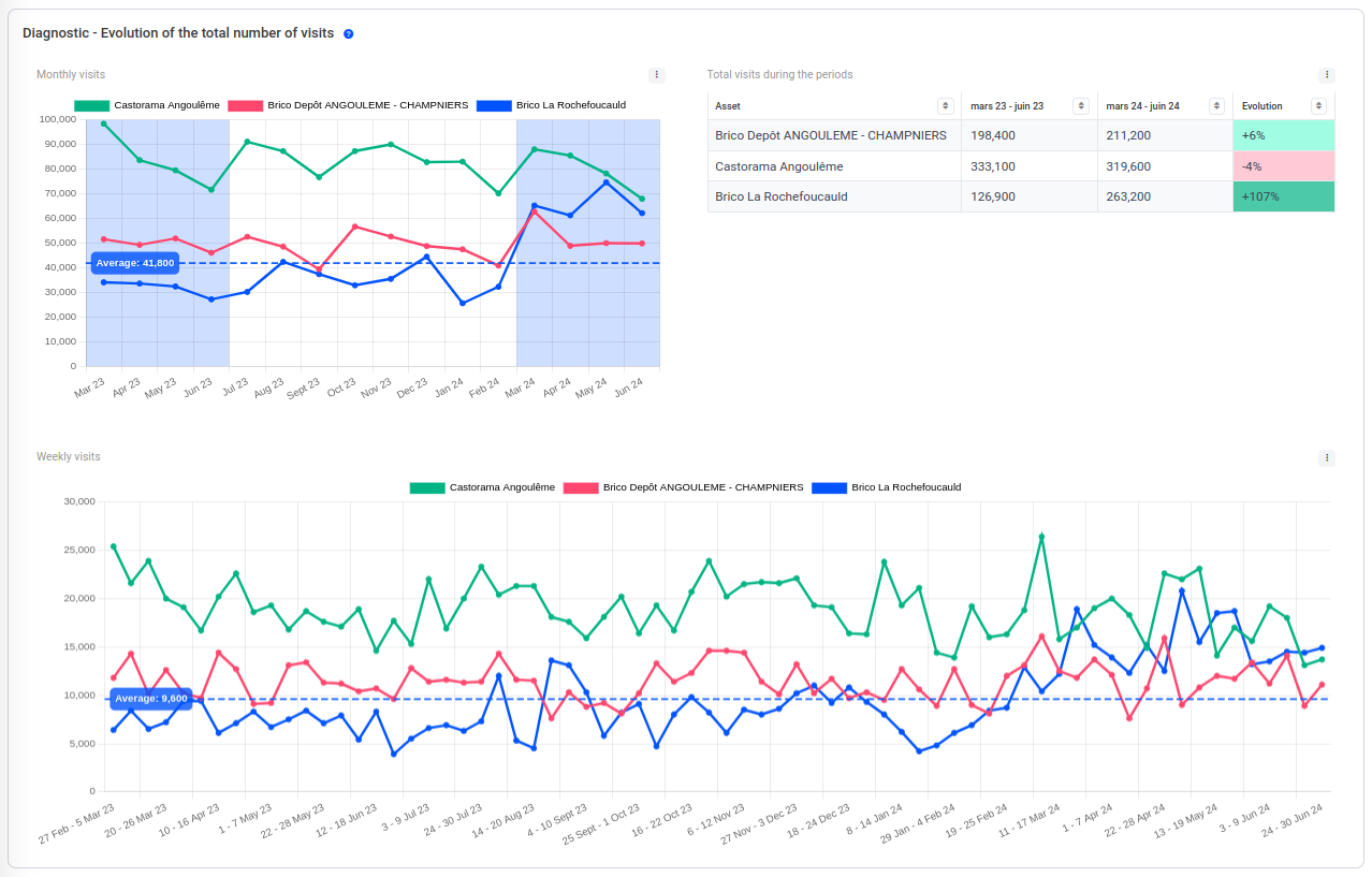 These first 3 analyses show changes in the number of visits to your centre or store over the period of your choice. They enable you to understand the history and trends and measure the impact of internal and external changes compared to your competitors.