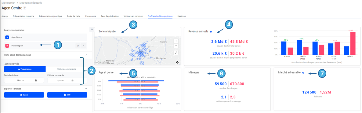 Exemple (basé sur la provenance) : En Février 2024, les visiteurs d'Agen Centre venant des communes alentours, avaient un pouvoir d'achat moyen de 20,6K annuel, contre 30,2k pour les visiteurs de Paris Wagram.