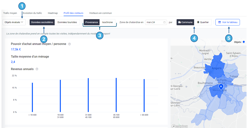 - Choisissez entre la provenance (lieu de provenance des visiteurs) et l'isochrone (l'environnement autour de l'objet) (3).