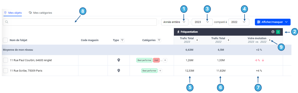 Vous aurez un aperçu du trafic pour tous vos objets et vous pourrez les comparer entre eux et à travers 2 périodes.