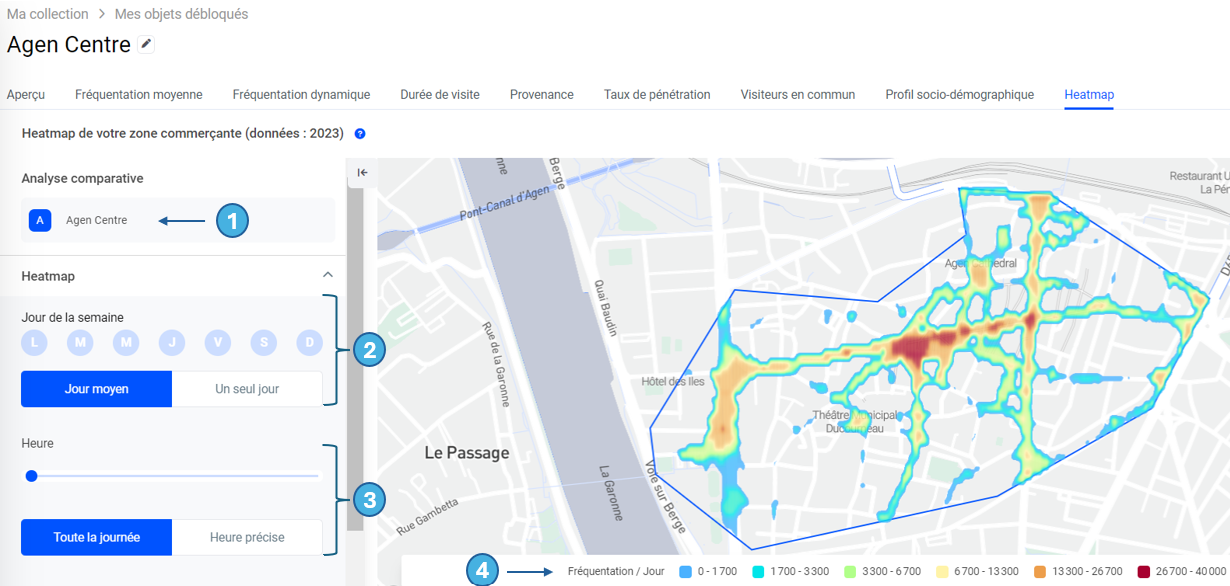 Une légende se trouve sous le graphique : les seuils et les couleurs associées varient en fonction de la fréquentation de la zone (4). Plus la zone est rouge, plus la fréquentation est élevée.