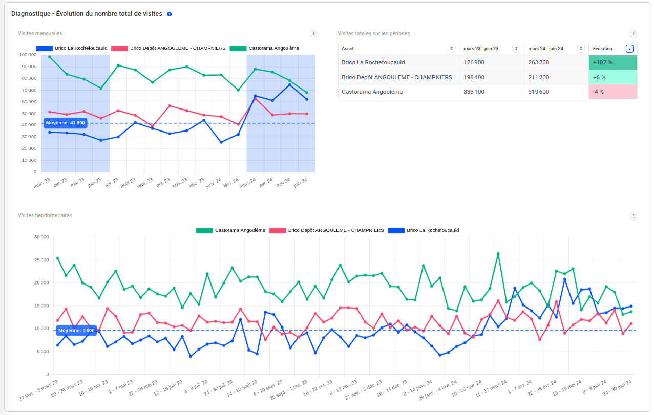 Exemple : Entre les 2 périodes, la fréquentation a augmenté de 107% en passant de 126 900 à 263 200 visites. En comparaison, la fréquentation du Castorama a diminué de 4% et celle du Brico Dépôt a augmenté de 6%.