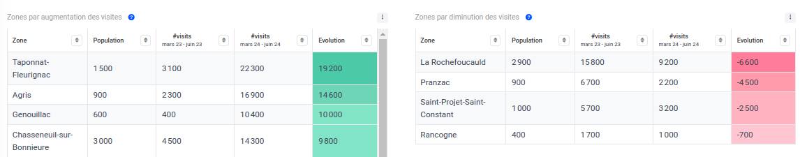 - La 4e colonne “Evolution” vous permet de comparer les 2 périodes et d'analyser le nombre de visites gagnées ou perdues par zone.