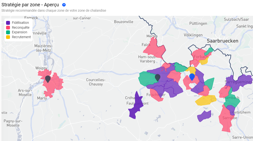 La carte vous permet de visualiser les stratégies recommandées par zone dans votre zone de chalandise.