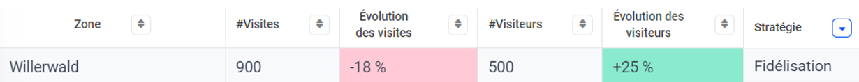 - Stratégie : celle que nous vous recommandons par zone, basé sur l'analyse des 4 premières colonnes (visites, évolution des visites, visiteurs et évolution des visiteurs)